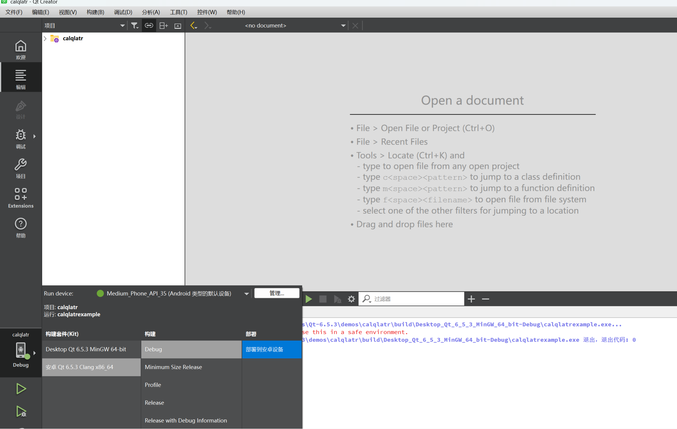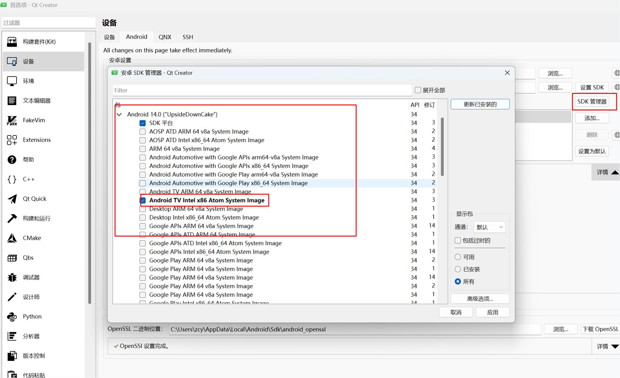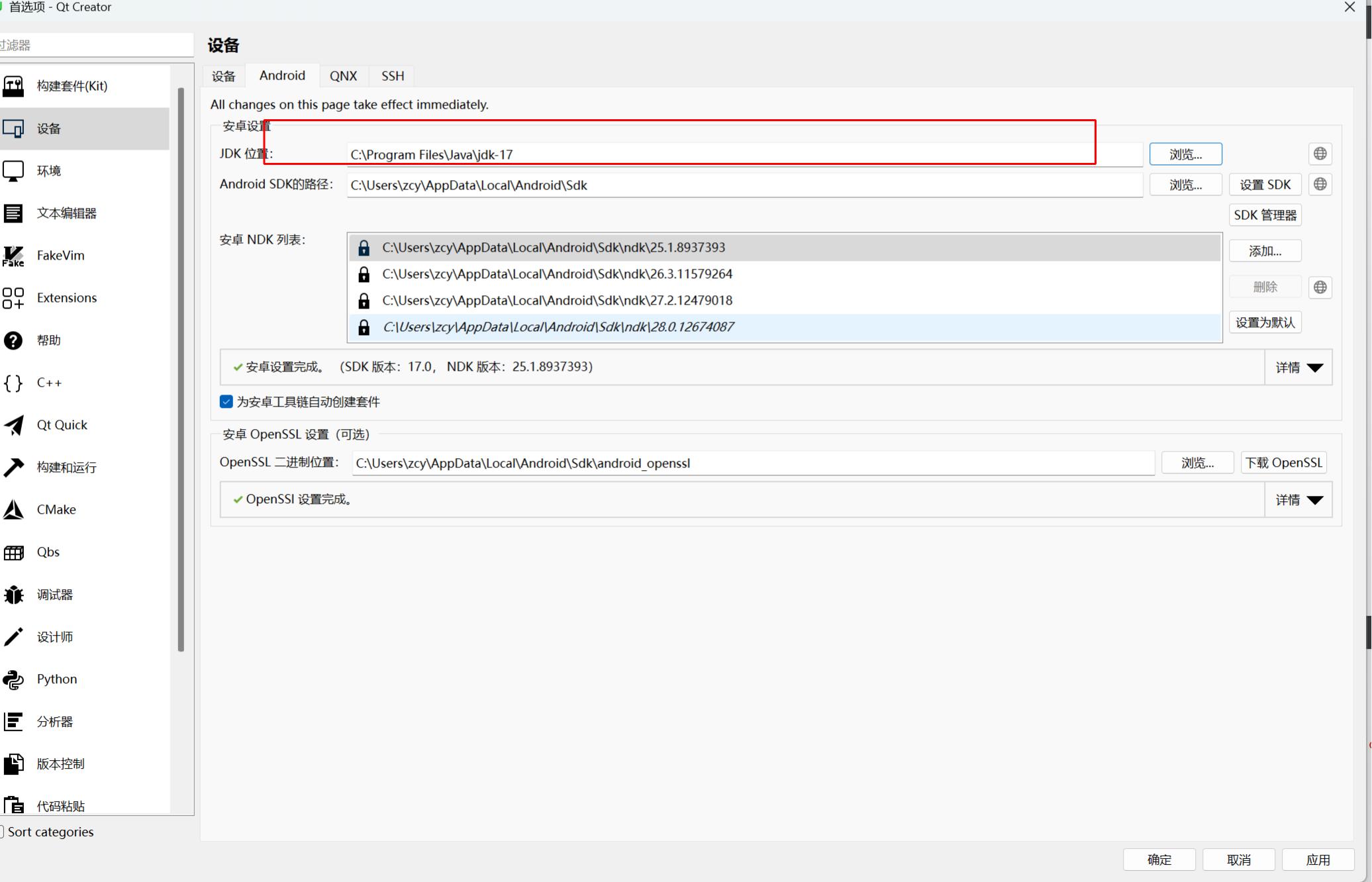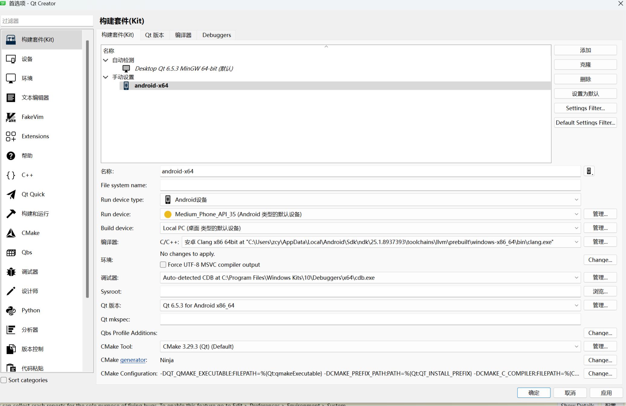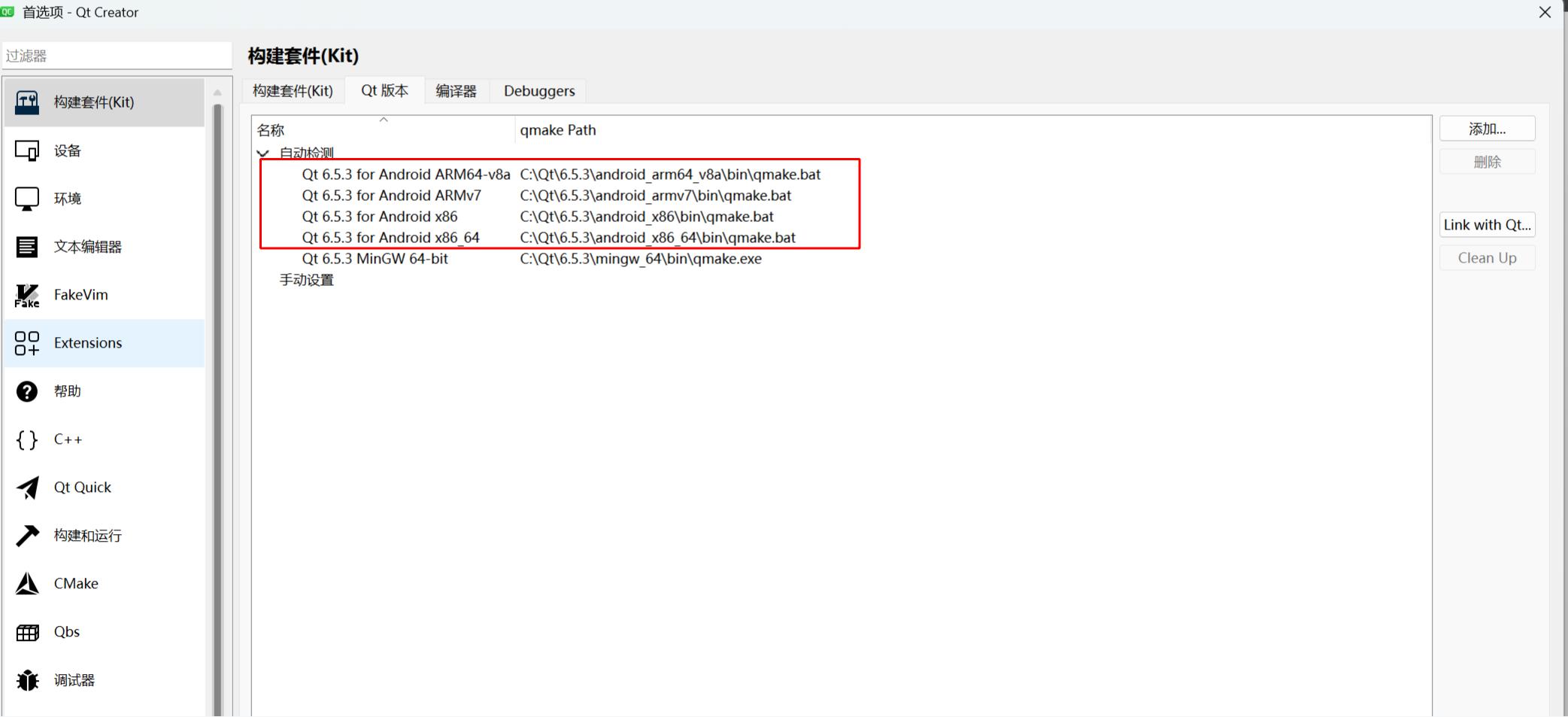 安装完成后,重启qt,在次打开工具->外部->配置->构建套件,就会看到Android相关编译工具链了 ,我们可以使用次工具链编译Android虚拟机,也可以使用adb连接Android设备进行开发。